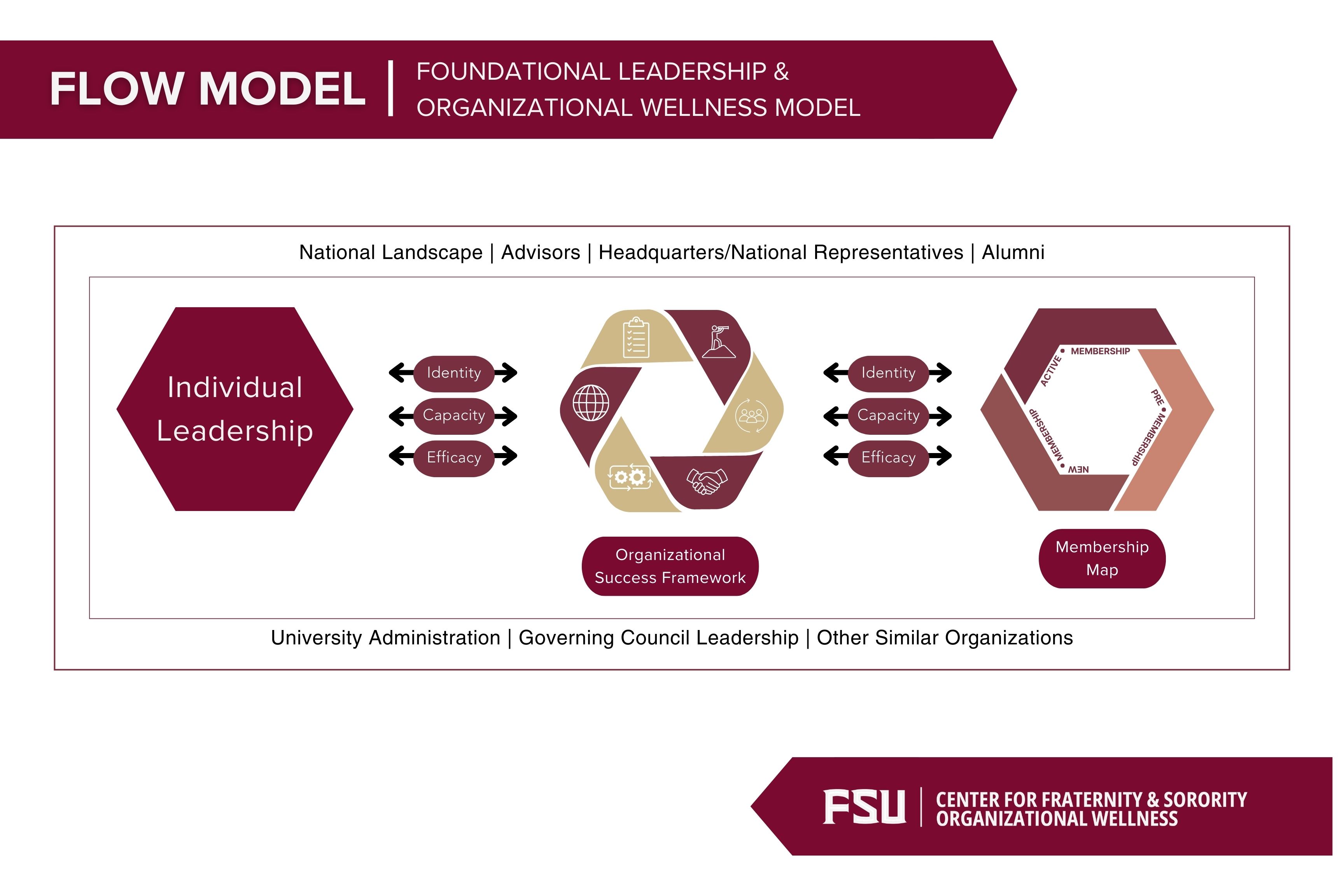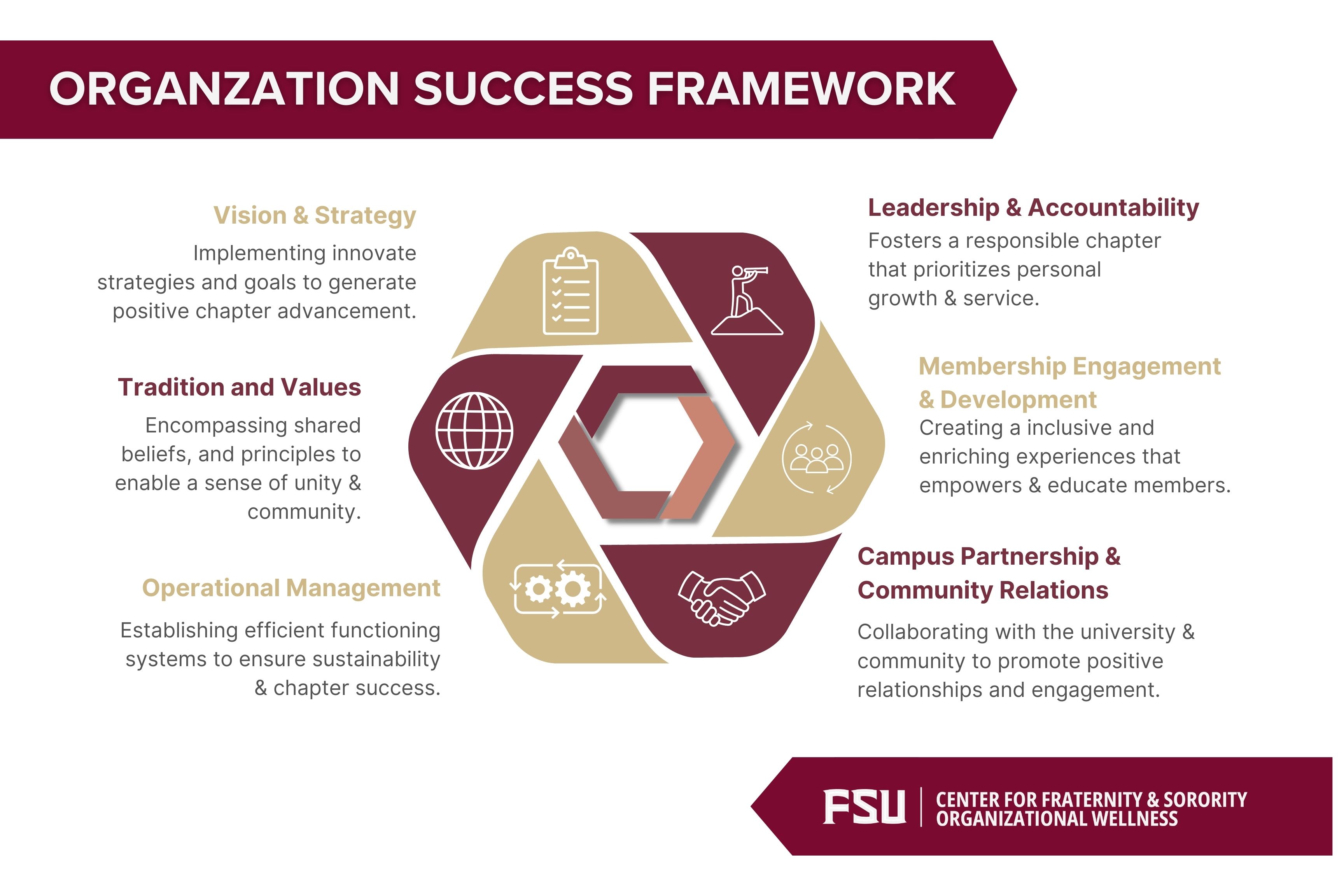 At the core of the FLOW model is the Organizational Success Framework. This framework focuses on six core elements to contextualize organizational success: vision and strategy, traditions and values, operational management, leadership and accountability, membership engagement and development, and campus partnership and community relations.